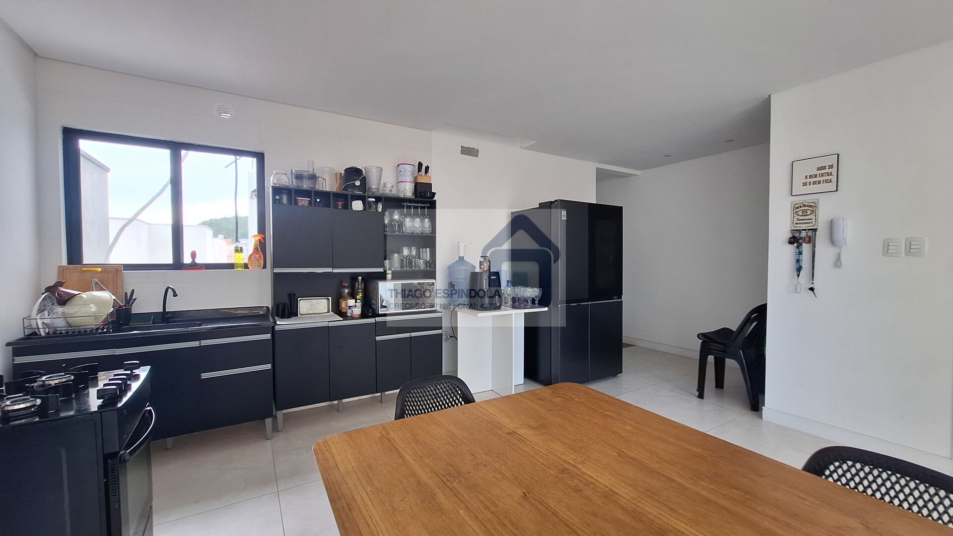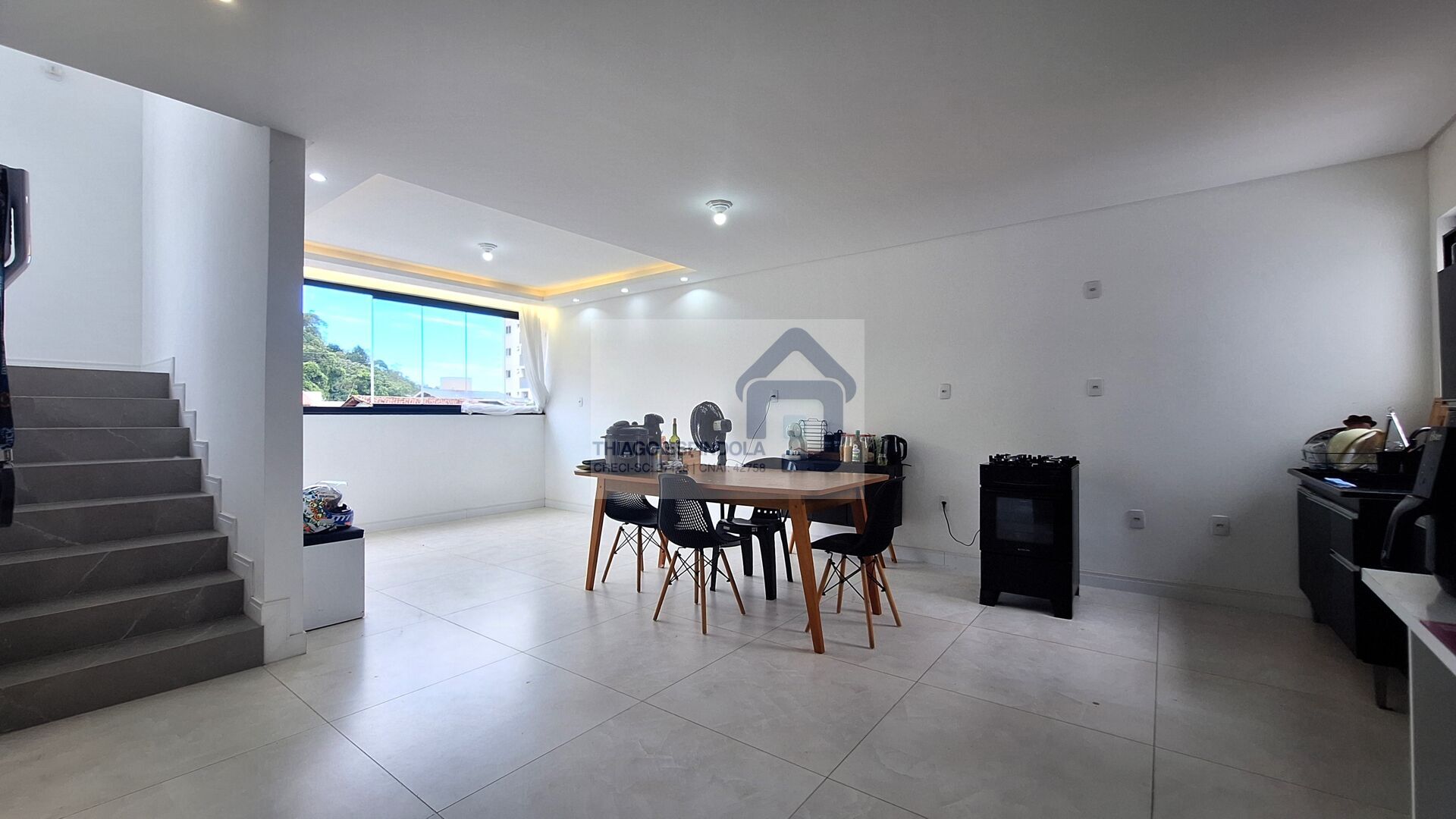 Sala de estar, jantar e cozinha integradas;